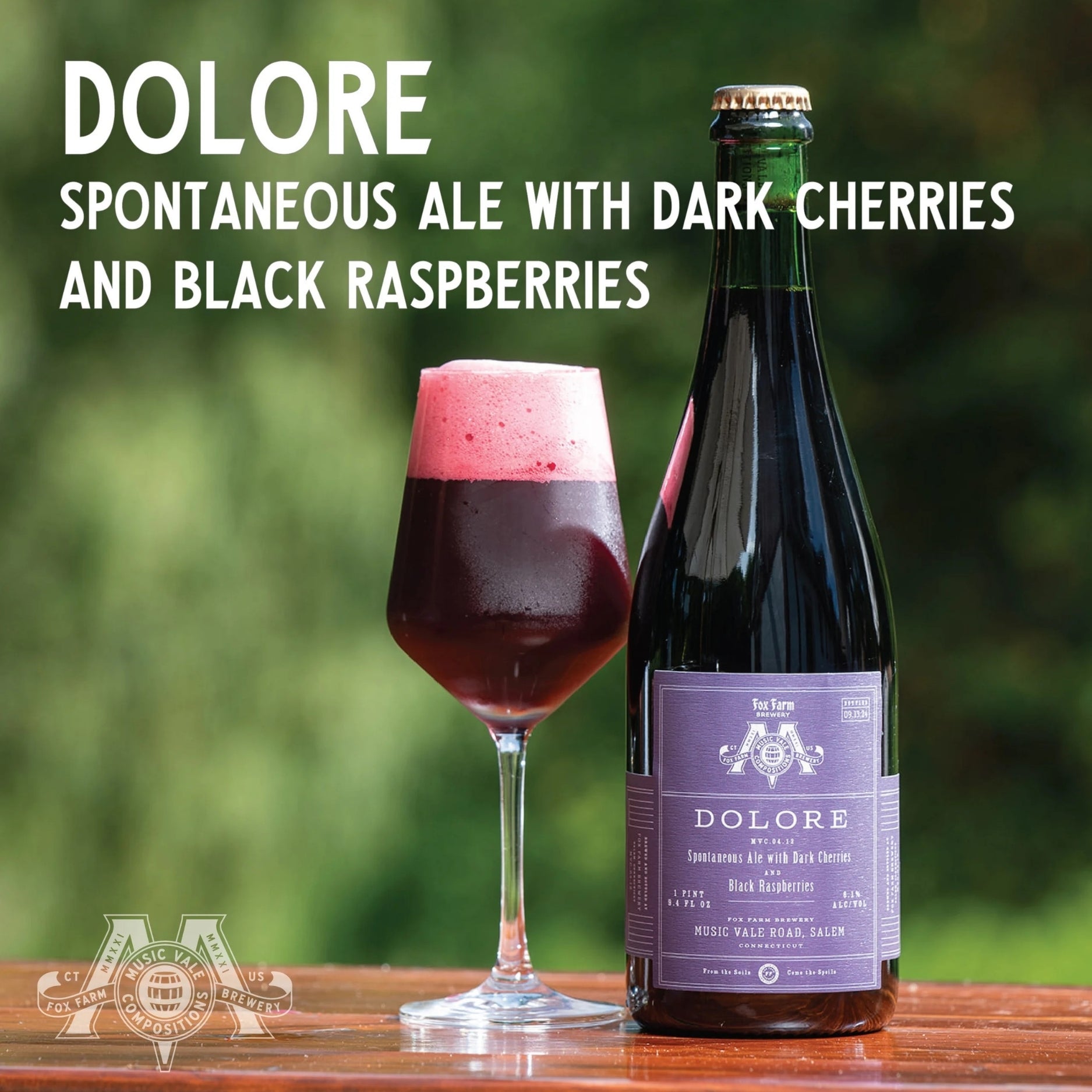 'Introducing Dolore, a new addition to Music Vale Compositions, our series of spontaneous ales. Dolore sees the pairing of our two favorite dark fruits (Black Raspberries and Morello Cherries) in a carefully assembled blend of barrel-aged beer spanning three years of spontaneous brewing. The common thread between those two fruits, and what makes them special, is their own complexity and depth. There are, of course, sweet, jammy undertones to each - beyond that however, black raspberries have an unmistakable earthy/woodsy flavor while the dark cherries we source have their own floral and black currant notes. Both bring in a vinous quality that works wonderfully in the style..'
